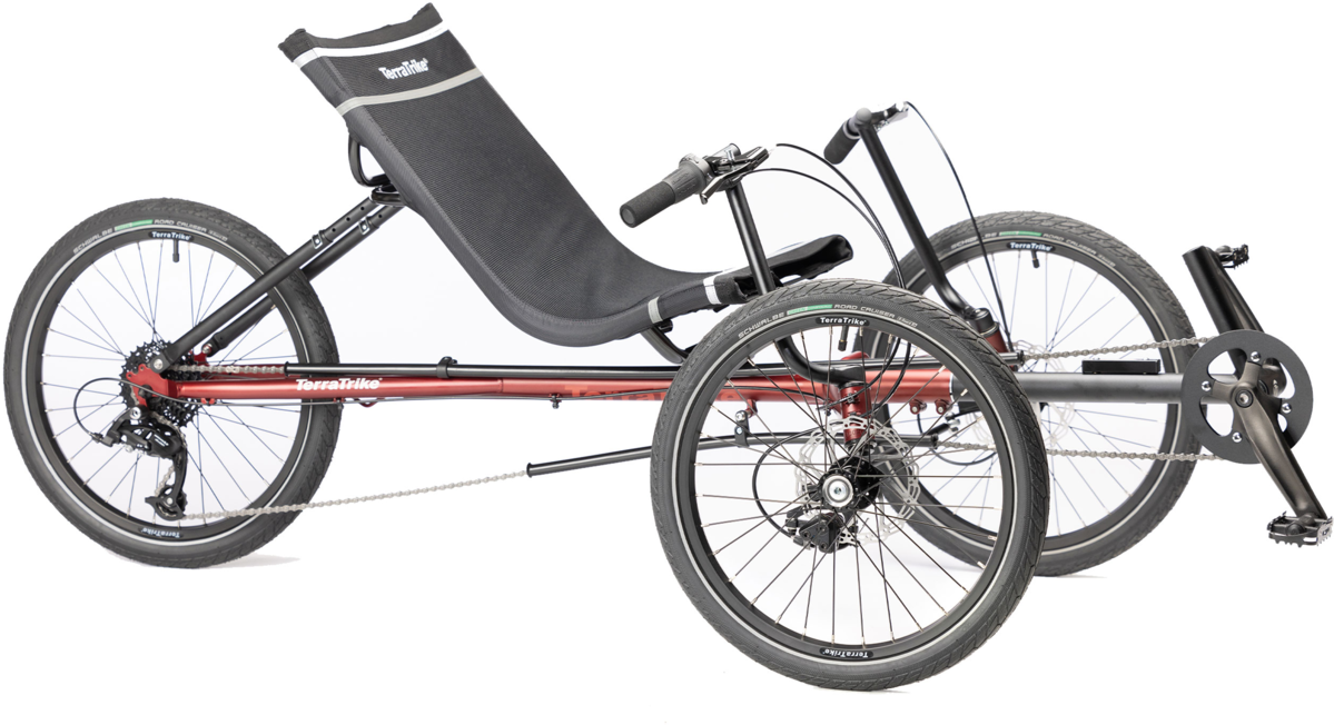 Experience cycling freedom on the Maverick, an entry level trike that packs a lot of features. The new wide seat with fixed seat mount provides riders with a firm and comfortable riding position. The versatile Maverick makes it easy to upgrade to the TerraTrike hybrid steering stack and the boom stub tube allows one to easily add a front derailleur.